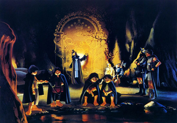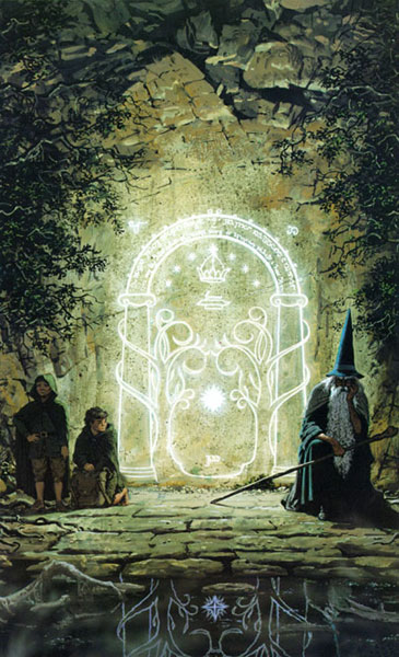 »Die Türen von Durin, des Herrn von Moria. Sprich, Freund, und tritt ein.« lautete die elbische Bogenschrift. Doch so einladend es auch klang, so schwierig gestaltete sich der Versuch das Tor zu öffnen. Gandalf versuchte Spruch auf Spruch. »Annon edhellen, edro hi ammen! Fennas nogothrim, lasto beth lammen!« erschall es und »Edro, edro!« befahl er mit donnernder Stimme doch nichts geschah. Mit gebeugtem Kopf saß er da und verfiel in angestrengtes Nachdenken. Und siehe, mit einer Plötzlichkeit, die alle Zusammenfahren ließ, sprang er auf und lachte: »Natürlich, natürlich, lächerlich einfach, wie die meisten Rätsel, wenn man die Lösung kennt. Mellon!« Und langsam teilten sich die beiden Türhälften und gaben eine Dunkelheit, schwärzer als die finsterste Nacht, preis. |