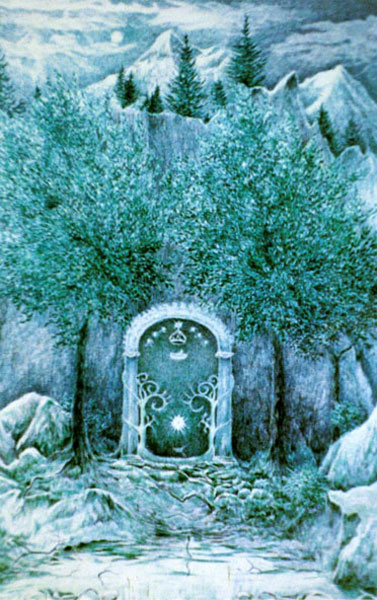 Doch keine Spur eines Tores oder eines Eingangs, nicht der kleinste Spalt oder Riss war in dem bedrohlichen Gestein zu erkennen. Ratlos sammelten sie sich am Ufer des in der Nähe befindlichen Sees. Als es langsam Abend wurde und der Mond die graue Felswand beschien, deuteten sich schwache Linien wie dünne Silberadern auf der Oberfläche ab. So hatten sie doch noch das Tor zu Moria entdeckt, welches durch geheime Zwergenkünste aus Ithildin geschaffen, nur im Mondlicht sichtbar wird. |