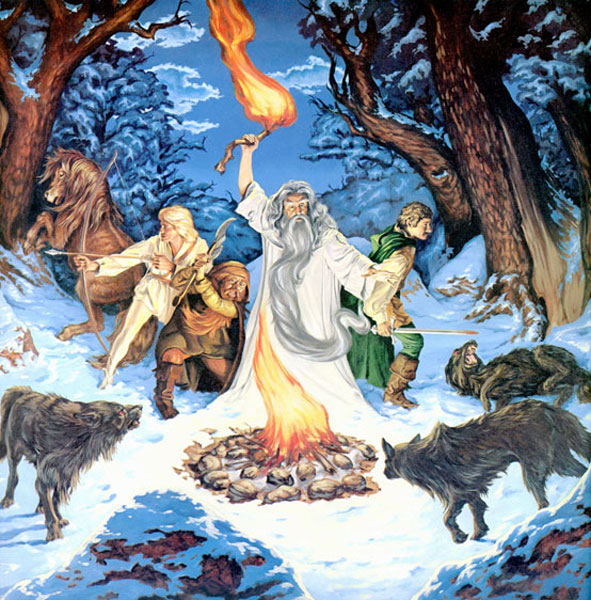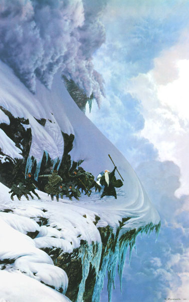 ...und es begab sich, dass die Gefährten nach einem Wege suchten, der sie über das Nebelgebirge bringen möge. Doch der Versuch, den Rothornpass am Fuße des Caradhras zu überqueren scheiterte durch einen plötzlich aufkommenden Schneesturm, der unsere Freunde zur Rückkehr zwang. Das Gebirge südlich zu umgehen hätte bedeutet, Isengart gefährlich Nahe zu kommen, wo der Zauberer Saruman seine eigenen dunklen Pläne bezüglich des Einen Rings schmiedete. |